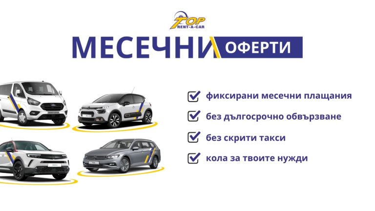 Не пропускайте възможността да се възползвате от месечни оферти и да си осигурите комфорт и свобода в движението си. С Top Rent A Car Вашият автомобил е само на един клик разстояние.