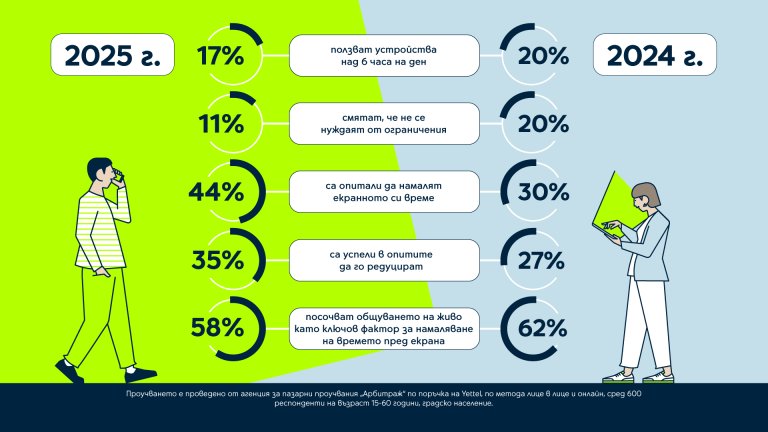 Добрата новина - и успеваемостта расте. 35% от опиталите през 2025 г. казват, че са успели да намалят екранното си време, спрямо 27% година по-рано.