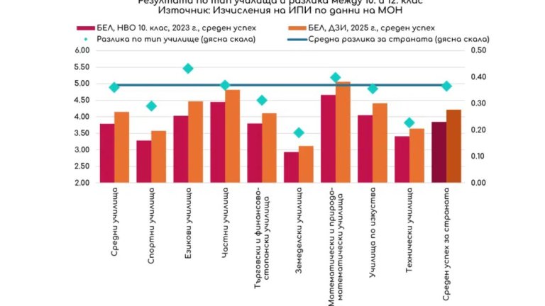 Учениците в математическите, природоматематическите и частните училища имат най-високи резултати по БЕЛ и на НВО в 10. клас, и на ДЗИ в 12. клас. Оказва се обаче, че много високите резултати трудно могат да нараснат още. С най-голям ръст на резултата са учениците от езиковите училища, които са трети по успех.