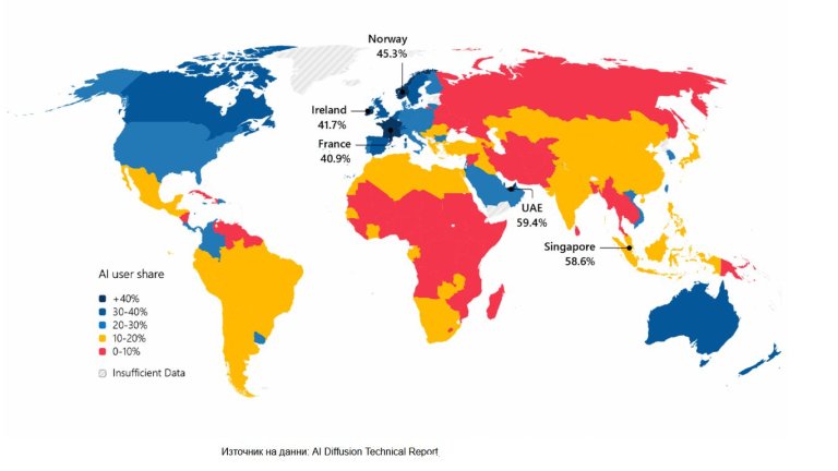 Числата разкриват обаче неравномерна дифузия. В някои страни като ОАЕ или Сингапур над половината от населението в трудоспособна възраст използва AI. В други региони, особено в Субсахарска Африка и в части от Азия, приемането е под 10%.