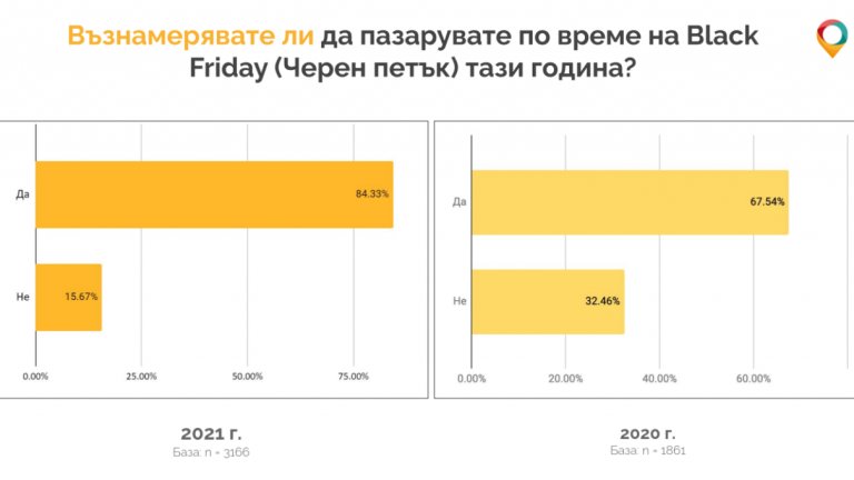 Резултатите показват, че 84% от включилите се в анкетата възнамеряват да пазаруват по време на Черния петък тази година, което е с 15% повече от миналата. Близо 55% от потребителите заявяват, че са пазарували и предишни години по време на кампанията Черен петък.