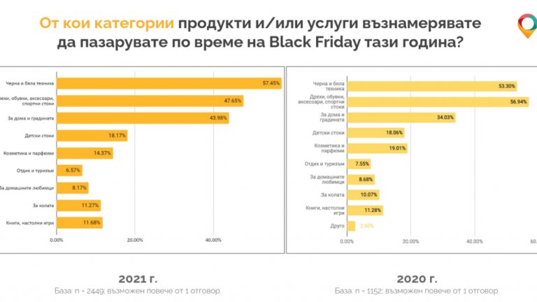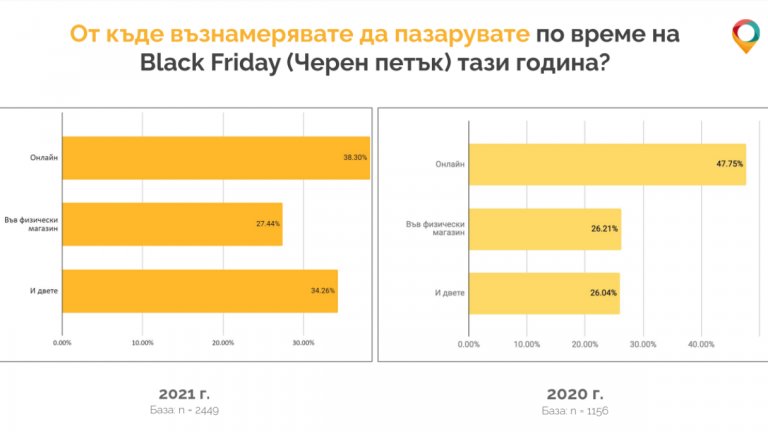 Около 38% от анкетираните, които планират покупки в периода на Черния петък през 2021 г., предпочитат да пазаруват онлайн, но все повече потребители са готови да се завърнат към пазаруването във физически магазин. 8% повече от потребителите през 2020 г., а именно 34%, планират да пазаруват както онлайн, така и на място.