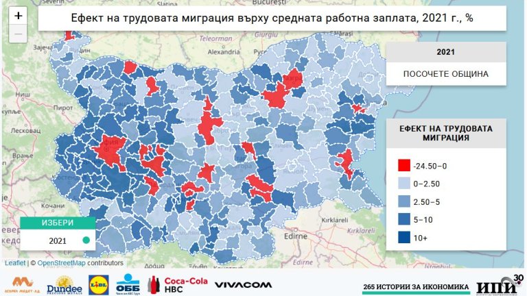 В общия случай трудовата миграция повишава средните доходи на работещите с под 10%, като това е вярно за 174 от общините. И тук най-видимото струпване на общини с по-значителен положителен ефект е около София.