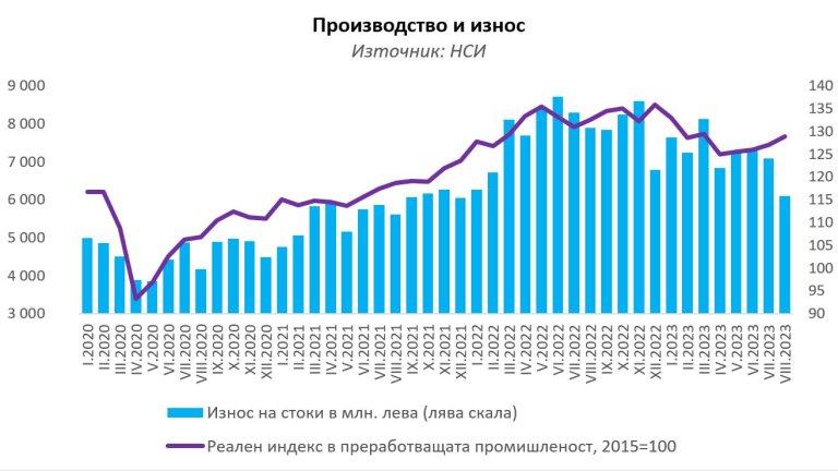 Износът на стоки за осемте месеца до август спада в номинално изражение със 7,6% спрямо същия период на 2022 г., а само за август спадът е с 22%. И това не бива да изненадва - през август общият реален индекс на промишлено производство е с 4,4% по-нисък от същия месец на 2022 г., а реалният индекс на продажбите на дребно има спад от 2,2% на годишна база.