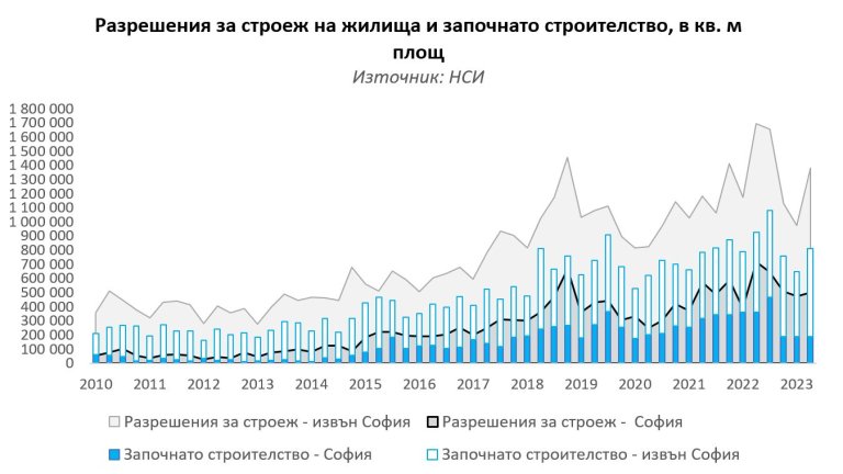 През второто тримесечие на 2023 г. вече виждаме спад на годишна база на средните цени на жилищата - 1,1% за целия ЕС, но стряскащи 9,9% в Германия. Пазарът на жилищни имоти в България още не дава толкова силни признаци за охлаждане, но пречупването на тренда на растеж вече се вижда. В три последователни тримесечия - от последното на 2022 г. до второто на 2023 г., както разрешенията за строеж на жилищни сгради, така и започнатите строежи на нови сгради отбелязват спад на годишна основа. Всичко това се случва при рекордно ниски лихви по ипотечните заеми - вече сред най-ниските в целия ЕС - и продължаваща експанзия на кредитирането с годишни ръстове от около и над 18%. Пренасянето на по-рестриктивната парична политика от еврозоната към България предстои.