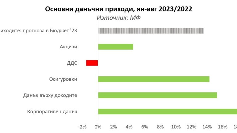 Доброто изпълнение - поне засега - е при приходите от данъка върху доходите и осигуровките, което отразява ниската безработица и ръста на заплатите, както и прихода от корпоративния данък, който обаче в голяма степен е резултат от конюнктурните печалби през 2022 г.