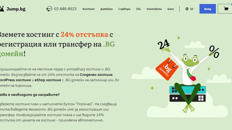 Платформи като Jump.BG предлагат стимули за бизнесите, които желаят да направят крачка към по-силно локално присъствие онлайн. В тази връзка Jump.BG предоставя 24% отстъпка от цената на услугите за хостинг, закупени заедно с .BG или .бг домейн.