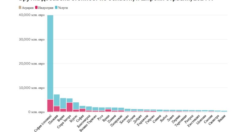 В същото време девет области, основно в Северна България, допринасят за под 1% от общия БВП. За сравнение, през 2000 г. делът на столицата е бил 26%, а области с под 1% липсват.