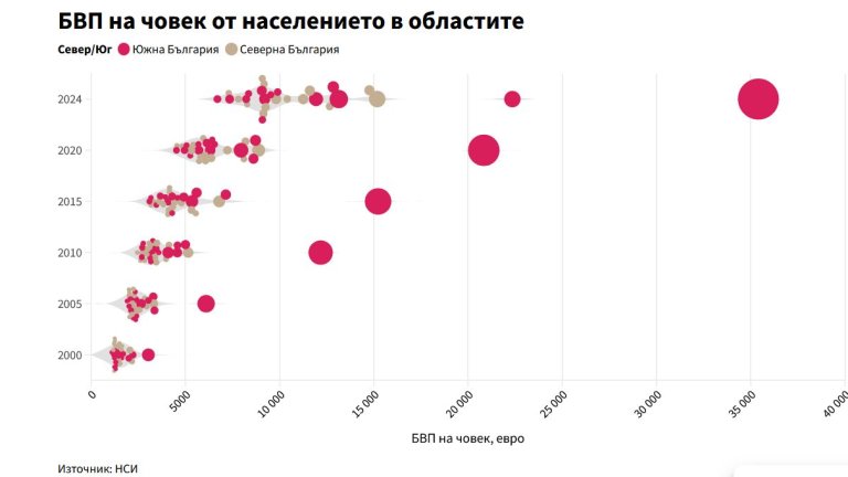Разликата в степента на развитие между столицата и най-слабо развитата област вече е почти 5,3 пъти при 4,8 пъти година по-рано. Ако погледнем по-назад в миналото, през 2000 г. тази разлика е била малко под три пъти, което говори за ускоряване на процеса на икономическа дивергенция в средносрочен план.