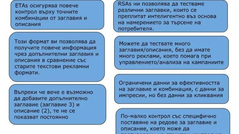 Разширени текстови реклами (ETA) срещу адаптивни реклами при търсене (RSA)