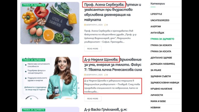 Един чудесен пример за това е един от нашите клиенти - онлайн аптека, където почти всяка статия е създадена с експертен принос от специалисти като лекари, кинезитерапевти, имунолози и диетолози. Всяка публикация започва с биографична информация за автора, което значително повишава доверието. Несъмнено бихте приели по-сериозно материал, написан от лекар, отколкото от анонимен автор - нещо, което, за съжаление, често се среща.
