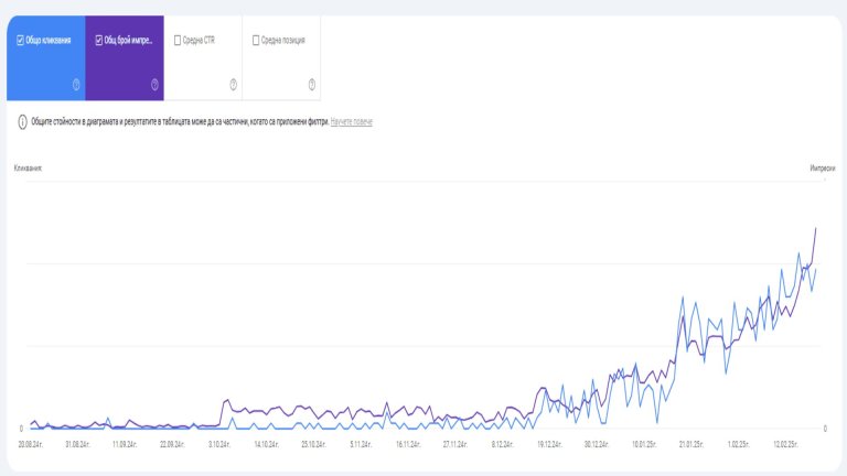 През ноември 2024 г. разписахме 6-месечна семантична контент стратегия и започнахме публикуването през декември същата година. Още с първите блог теми и лендинг страници се забелязаха резултатите: повишен трафик и класиране за повече ключови думи поради семантично богатото съдържание.