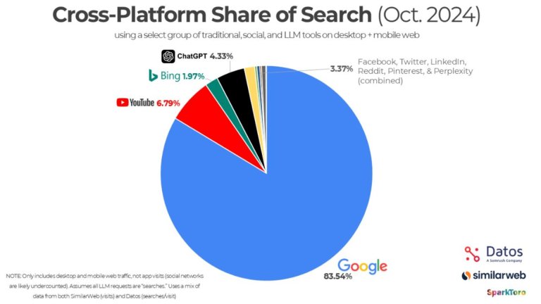 Все повече потребители се обръщат към LLM модели, като ChatGPT, Perplexity и Claude, за намирането на информация. Според данни на Datos и SimilarWeb (3) пазарният дял на ChatGPT се оценява на 4,33%, като се прогнозира да расте с 13% на месечна база.