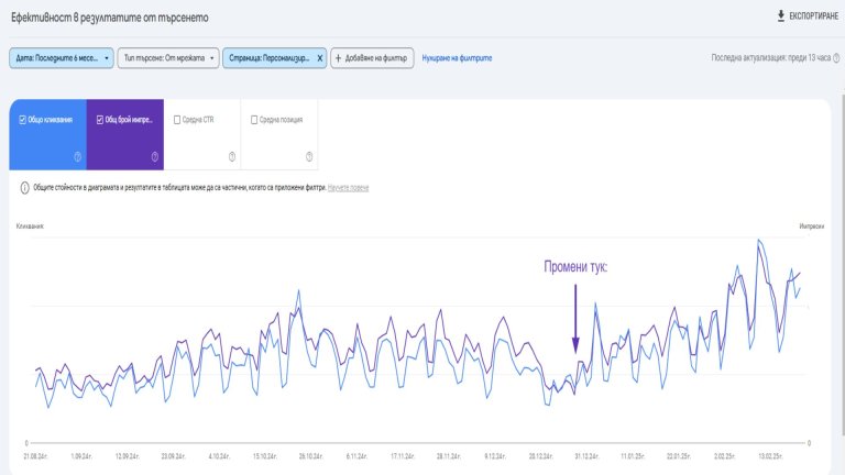 В рамките на 2 месеца успяхме да удвоим кликовете и да утроим импресиите на двете основни категории, като тук не броим допълнителния трафик към подкатегориите.