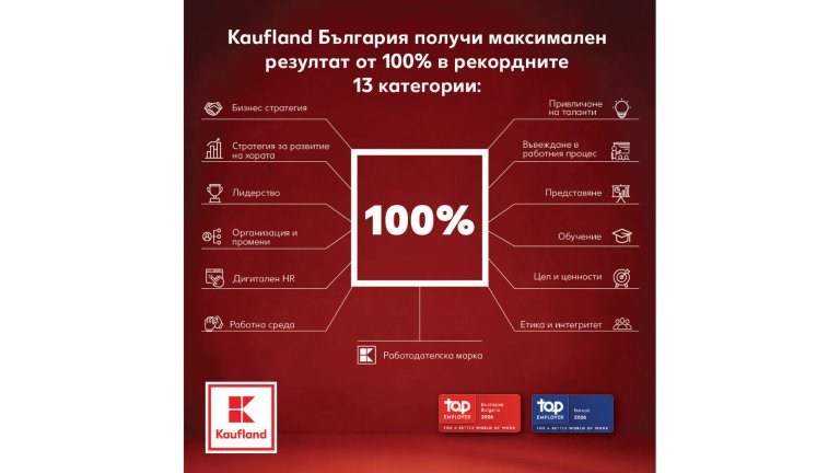 Методологията на Top Employers Institute се прилага в над 120 държави и се счита за един от най-обективните анализи на работодателските практики в световен мащаб. За поредна година Kaufland България получи отличието както на национално, така и на европейско ниво, заедно с всички държави от групата Kaufland. Този резултат поставя компанията сред водещите европейски компании с утвърдени работодателски практики.