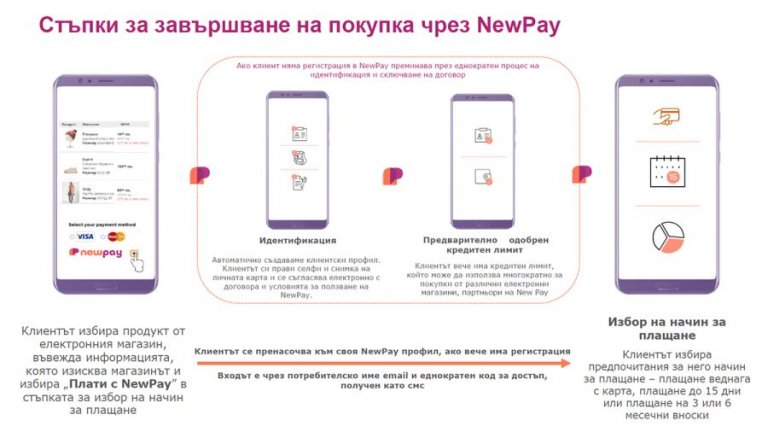 NewPay е алтернативен начин за плащане на покупки от електронни магазини, интегрирани с NewPay-бутон в checkout. С него клиентите на всеки онлайн търговец могат да финансират покупката си на момента, като кандидатстват и създадат свой профил еднократно, бързо и лесно. Веднъж заявили услугата, те разполагат с три начина на плащане - до 15 дни, на 3- или 6-месечни вноски или веднага чрез vPOS на NewPay в профила си в платформата.