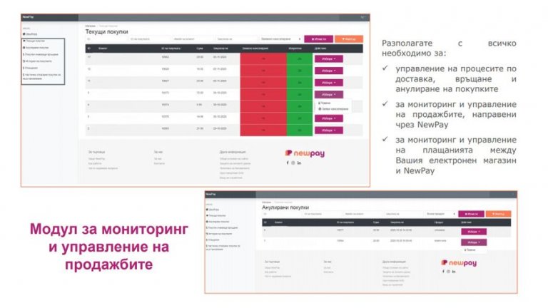 - мониторинг и управление на плащанията между вашия електронен магазин и NewPay.